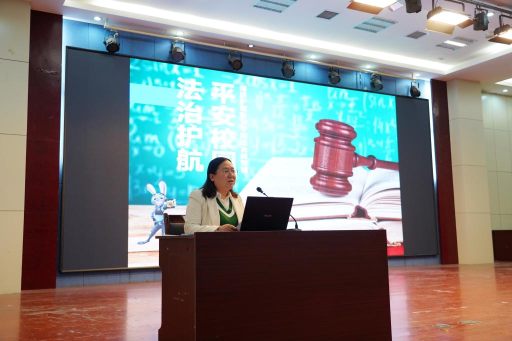 为深入学习贯彻党的二十大精神,全面践行总体国家安全观与习近平法治思想,扎实推进学院国家安全与法治校园建设,切实提升师生法治素养与安全风险防范能力,全力守护校园安全稳定,在2026年4月15日第十一个全民国家安全教育日到来之际,学院特邀法治副校长、青州市东关派出所院校警务室警官莅临主校区,开展国家安全与法治安全专题讲座。主校区各院系辅导员及学生代表 400 余人到场参加。